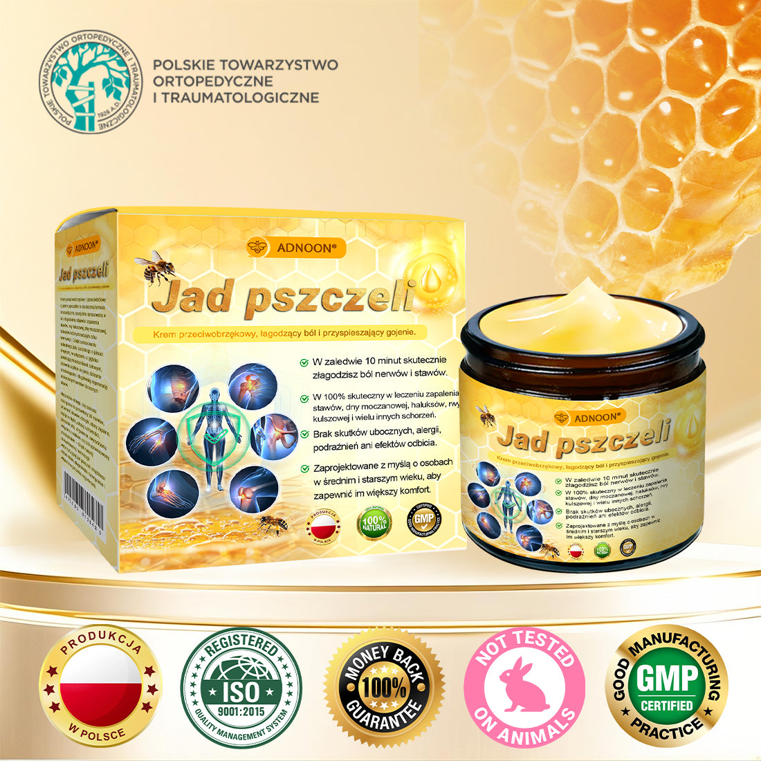 Nasza ADNOON® Zaawansowany krem z jadem pszczelim na leczenie stawów i kości jest idealny dla Ciebie! We współpracy z czołowymi ekspertami w dziedzinie medycyny naturalnej i apiterapii opracowaliśmy rewolucyjny krem, który wykorzystuje leczniczą moc naturalnego jadu pszczelego w walce z szeroką gamą problemów zdrowotnych. ADNOON® Zaawansowany krem z jadem pszczelim na leczenie stawów i kości to klucz do bezbólowego i zdrowszego życia, który pozwoli Ci w pełni cieszyć się każdym dniem.